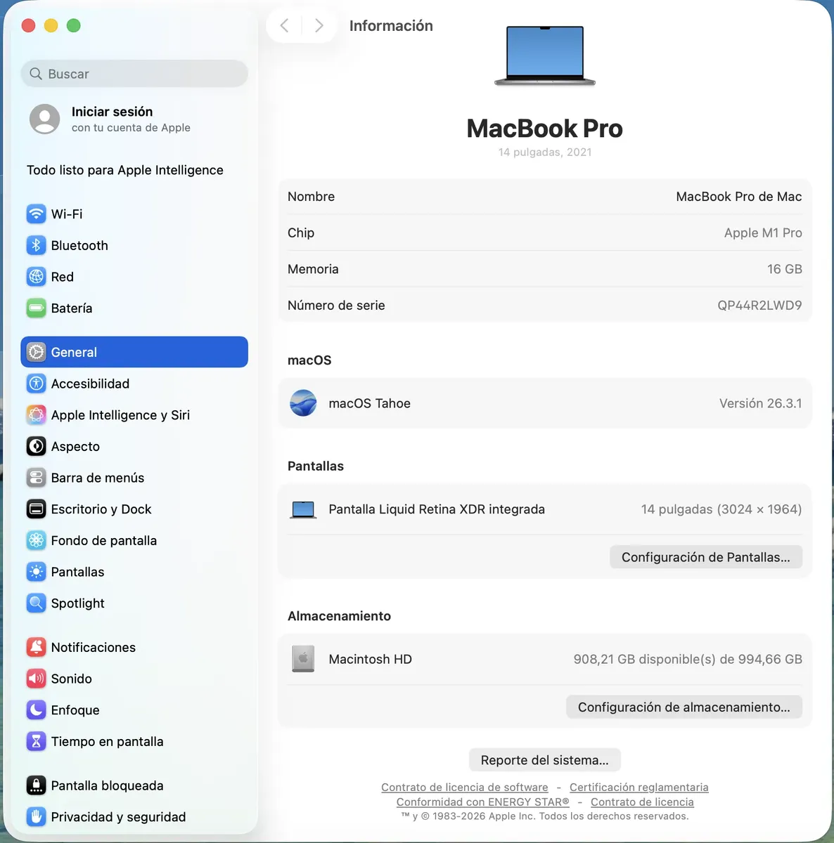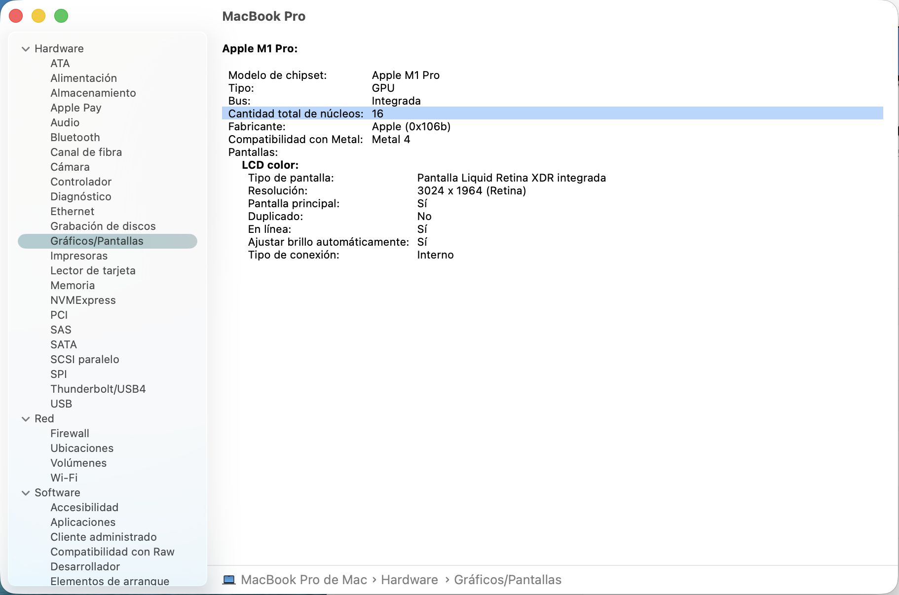 MacBook Pro M1 Pro de 14 pulgadas, una herramienta poderosa diseñada para profesionales y creativos. Con su procesador Apple M1 Pro y 10 núcleos, ofrece un rendimiento excepcional que permite ejecutar aplicaciones exigentes con facilidad. La memoria RAM de 16 GB y el disco SSD de 1 TB garantizan un almacenamiento rápido y eficiente, ideal para proyectos de gran envergadura. La pantalla Liquid Retina XDR, con una resolución de 3024 px x 1964 px y una frecuencia de actualización de 120 Hz, proporciona imágenes vibrantes y detalladas, perfectas para edición de video y diseño gráfico. Su diseño en color gris espacial no solo es elegante, sino que también es ligero, con un peso de solo 1.61 kg, lo que lo hace fácil de transportar. La duración de la baterÃa de hasta 17 horas asegura que puedas trabajar sin interrupciones, mientras que la conectividad USB Thunderbolt 4 permite transferencias de datos rápidas y conexión a múltiples dispositivos. Con un sistema de sonido Dolby Atmos y una cámara web Full HD, este portátil es ideal para videoconferencias y entretenimiento. El MacBook Pro M1 Pro es más que un simple portátil; es una inversión en productividad y creatividad. Su diseño robusto y sus caracterÃsticas avanzadas lo convierten en la elección perfecta para quienes buscan un rendimiento superior en un formato compacto.