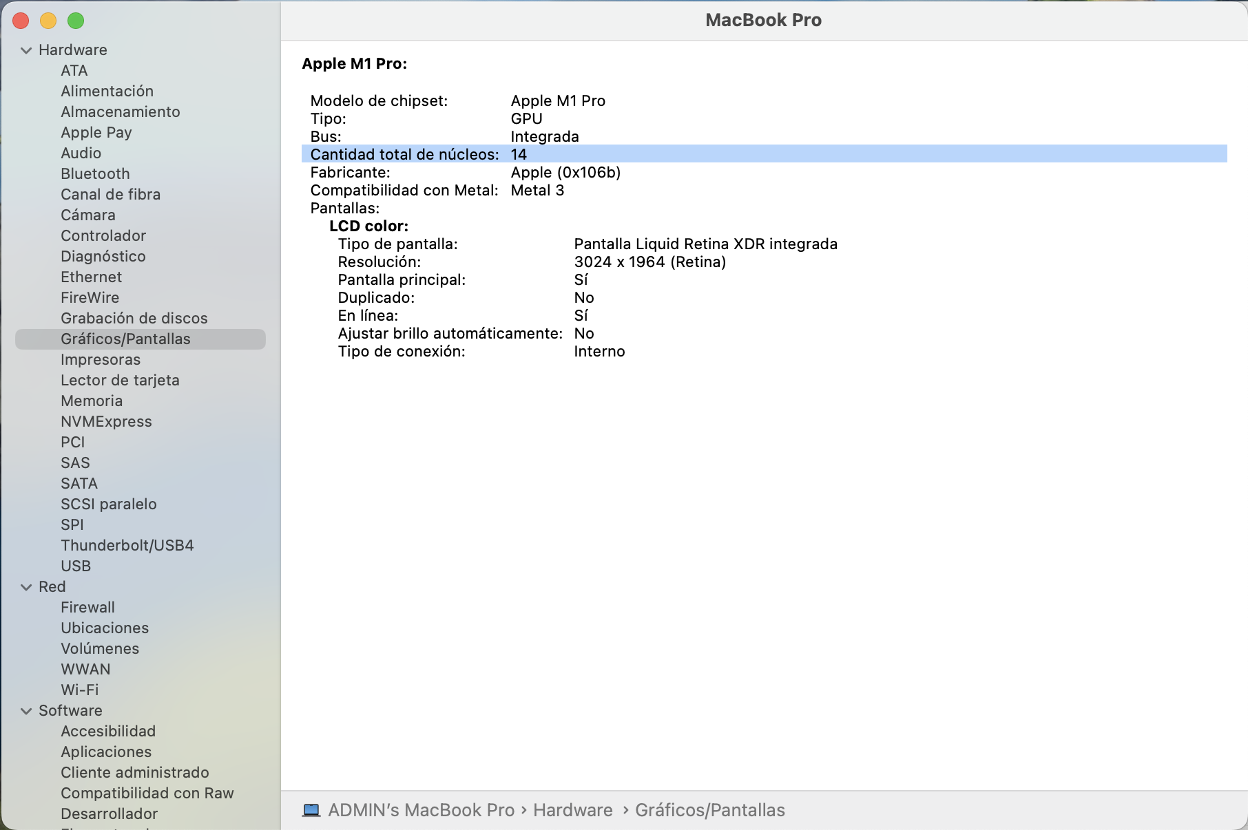 La Apple MacBook Pro de 14 pulgadas con chip M1 Pro en color plata es la herramienta ideal para profesionales y creativos que buscan un rendimiento excepcional. Su pantalla Liquid Retina XDR ofrece una resolución impresionante de 3024 px x 1964 px, con una frecuencia de actualización de 120 Hz, garantizando imágenes nÃtidas y colores vibrantes. Con un procesador de 10 núcleos y una velocidad máxima de 3.22 GHz, esta laptop maneja tareas exigentes con facilidad.