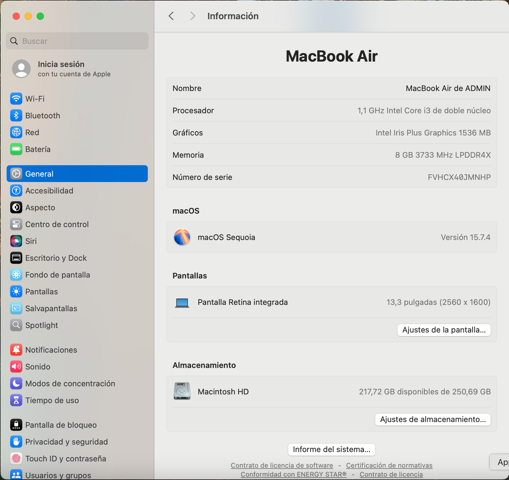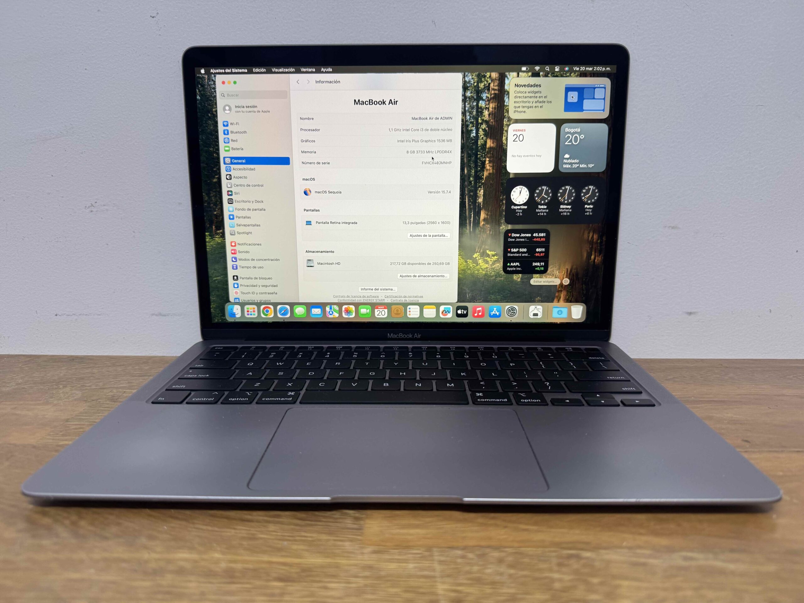 Portátil Apple MacBook Air 13.3” Core i3 ESPECIFICACIONES PRINCIPALES Procesador Intel Core i3 de doble núcleo a 1.1 GHz, ideal para tareas diarias y productividad. Memoria RAM de 8 GB LPDDR4X para un rendimiento fluido y multitarea eficiente. Almacenamiento SSD de 256 GB, rápido y seguro para tus archivos y aplicaciones. PANTALLA Y GRÁFICOS Pantalla Retina integrada de 13.3 pulgadas con resolución 2560 x 1600, ofreciendo imágenes nítidas y colores vibrantes. Gráficos Intel Iris Plus Graphics con 1536 MB, perfectos para visualización multimedia. SISTEMA OPERATIVO Y CONECTIVIDAD Incluye macOS Sequoia versión 15.7.4, garantizando seguridad y facilidad de uso. Conectividad Wi-Fi, Bluetooth y puertos esenciales para tus dispositivos. RECOMENDACIONES Ideal para estudiantes, profesionales y usuarios que buscan portabilidad, diseño elegante y alto rendimiento. Recomendado para uso en oficina, estudio y entretenimiento.